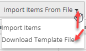 - If you have your data in an EXCEL spreadsheet, you can upload that data. Click IMPORT ITEM FROM FILE (see attachment below) and click DOWNLOAD TEMPLATE FILE in order to download our template. Transfer your data to this spreadsheet template, then click on IMPORT ITEMS and follow the prompts.