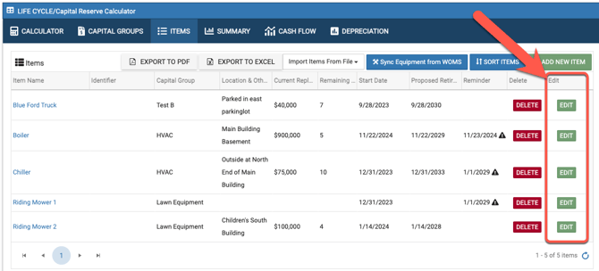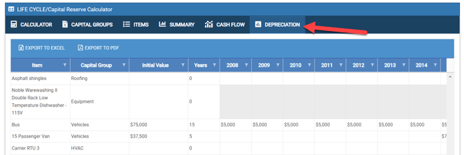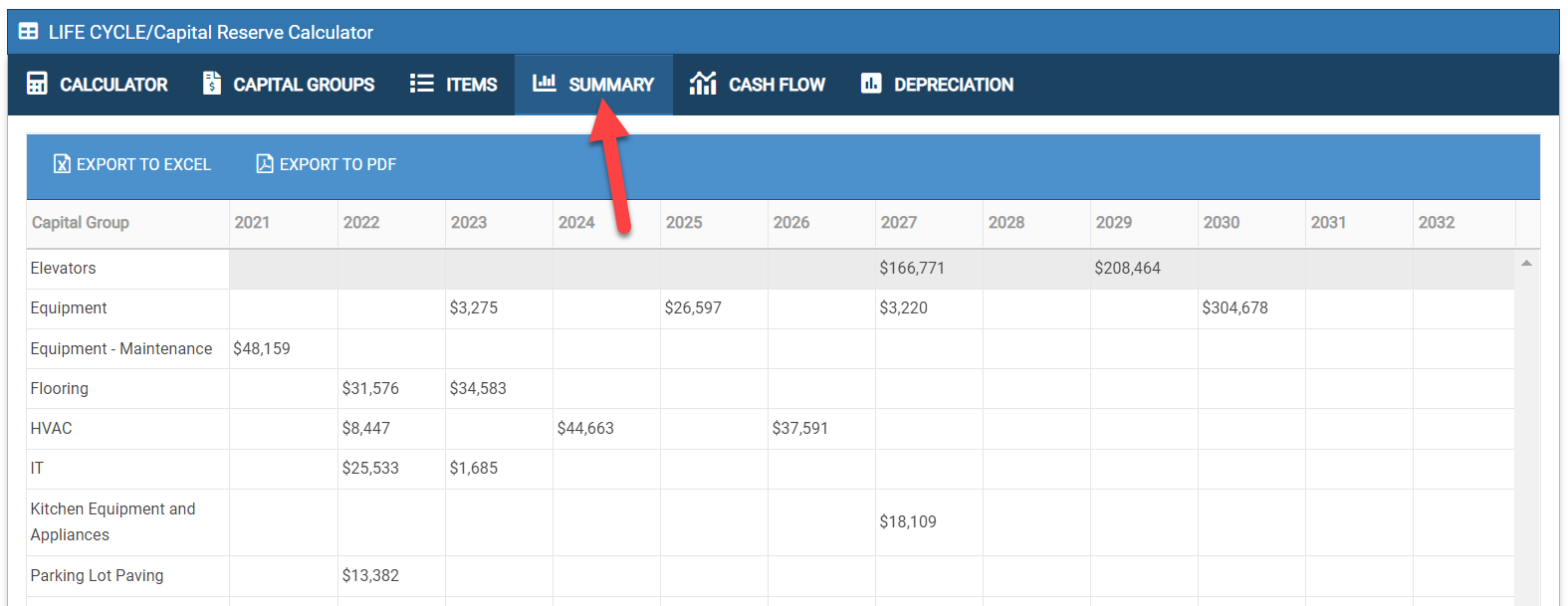 - SUMMARY – This page will show you the amount of monies that need to be retained for capital replacement purposes based on the year and Capital group.