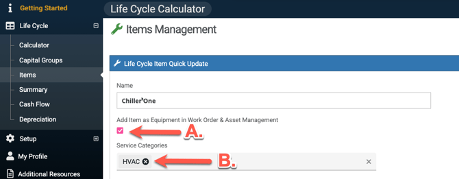 - Add to Work Order Management – if you are an eSPACE Work Order Management subscriber, you can add new EQUIPMENT to your account by checking the box. This will allow you to include ITEMS to the Life Cycle Calculator AND Work Order Management from this setup screen.