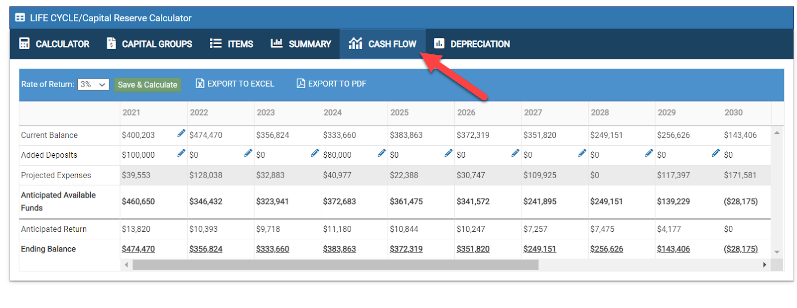 - CASH FLOW - This page allows you to adjust the rate of return, current balance and Added Deposits helping you to know just how much you can reinvest elsewhere