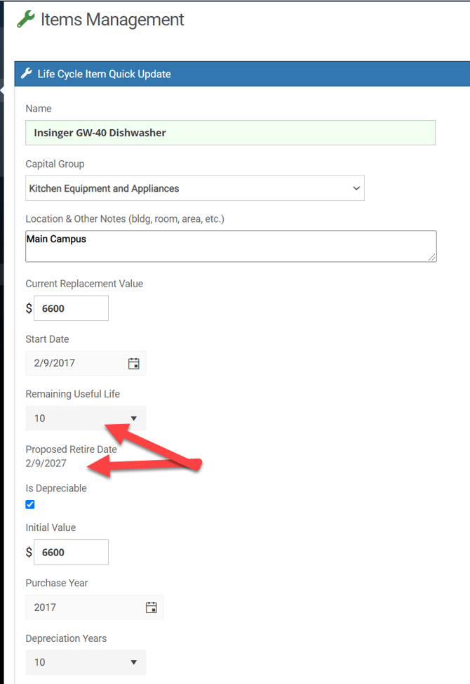 - If this is an Item already in service, then you have 2 options which will have direct impact on the Remaining Useful Life (RUL). You can either list the date it was put into service. If so, then the RUL would need to be the original life expectancy. The other approach (BEST PRACTICE) is to set the Start Date as current and only project the RUL as future life expectancy. This will provide you with a more accurate picture of the funds needed in the future to address the replacement of the item.