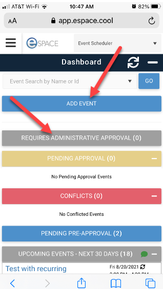 First, you can Submit an event by clicking Add Event and by clicking in the Requires Admin Approval grid to Approve: