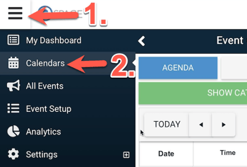 After (1) clicking the three lines in the top left, then (2) choose Calendars