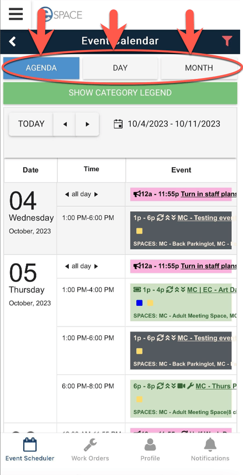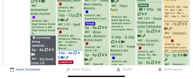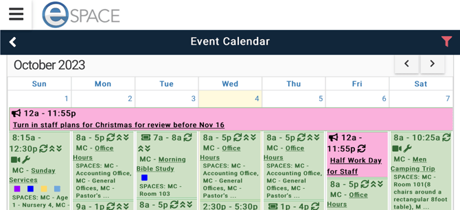 After transitioning to Landscape mode on your Mobile Device, events appear with additional information such as event category colors, "Offsite" and "Virtual" tags, space info and more!