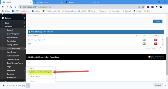 In order to set this up, click on a hyperlink in eSPACE for an image file (like JPEG) and then you will see an icon appear in the lower left corner (see below).