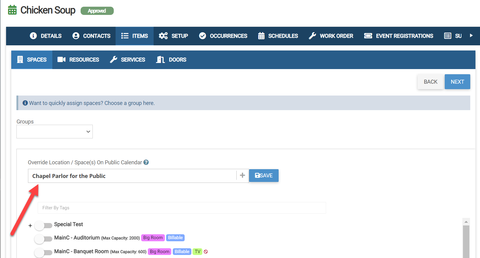 Now, when you add an "Override Location/Space(s)" name under the Event>Items>Spaces tab as shown below, you will be able to see this in your API data: