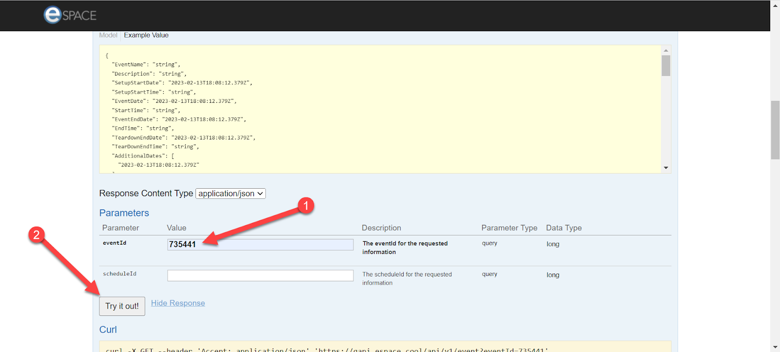 Now, 1) enter the Event ID and 2) click "Try it out!"