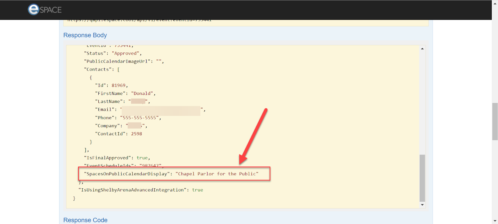 Once the process is done you can scroll down to the bottom within "Response Body" and find the data for "SpacesOnPublicCalendarDisplay" - see below
