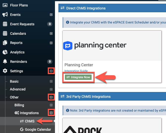- B. From the left side menu, click on Settings>Other>Integrations>ChMS