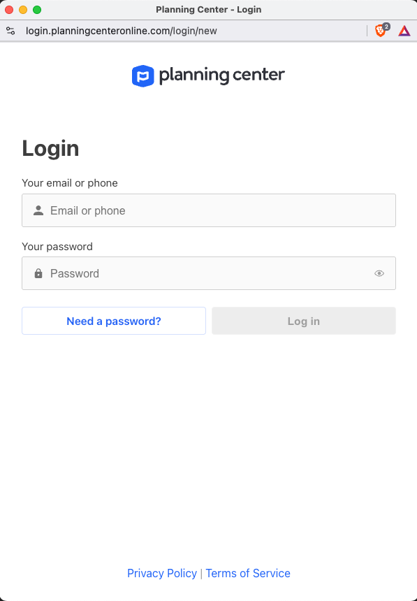 2. Enter your username and password for Planning Center and click "Log in".