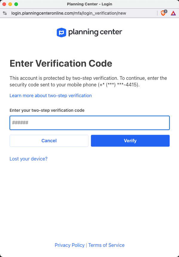 3. If your Planning Center account is set up for 2 factor authentication, then enter in the verification code that Planning Center texted you.