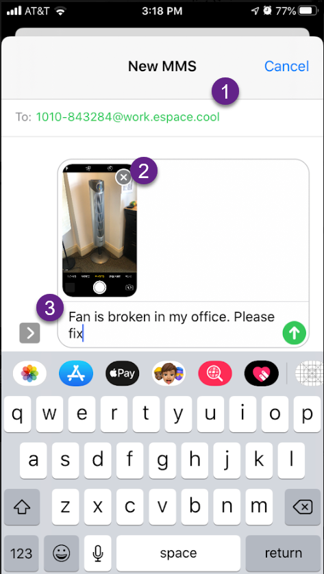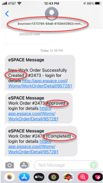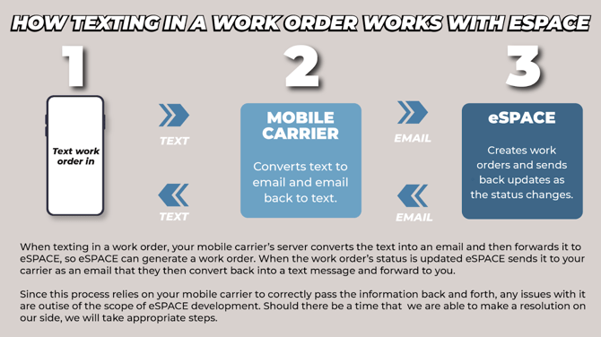 When texting in a work order, your mobile carrier's server converts the text into an email and then forwards it to eSPACE so eSPACE can generate a work order. When the work order's status is updated, eSPACE sends it to your carrier as an email that they then convert back into a text message and forward to you.