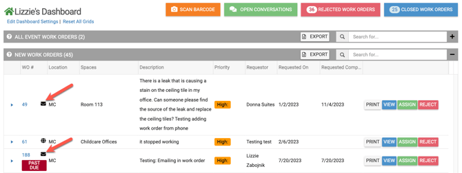 After sending the text, the new Work Order appears on the Dashboard showing the phone number as the Requestor