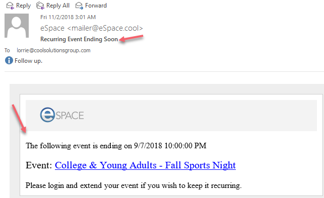 If your event is a recurring event over a period of time, you will have the option to receive an email reminder a month before your event ends (see first attachment below) so that you can extend the event by a few occurrences OR copy the event (which will automatically copy all the details) and select new dates to have the event continue fro a whole another year.