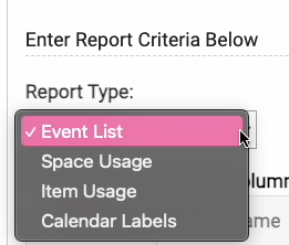 - You have 4 options: Event List, Space Usage, Item Usage or Calendar Labels.