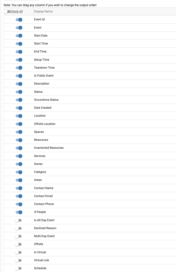 - Example Two: If you choose "All" and then toggle on Room 101 and Food Service, the report output will include events that have both Room 101 AND Food Service items together on the same event. However, if there are other items associated with the event, those items will also be included.