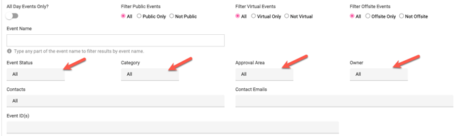 - 6. Choose the filters that you want to use including Event Status, Event Category, Approval Area, Owner and more!