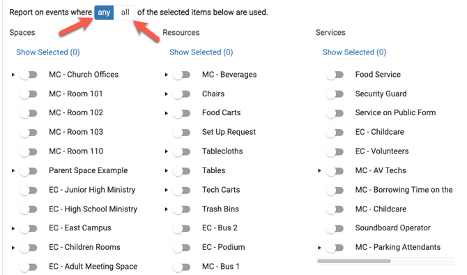 - 8. As an option, you can also include "Any" or "All" items that you want to include. If you don't toggle any "on" then the report will assume you want all events with all spaces, resources and services. To filter the report by event with certain spaces and/or resources and/or services, make sure to toggle those specific ones on before running the report.