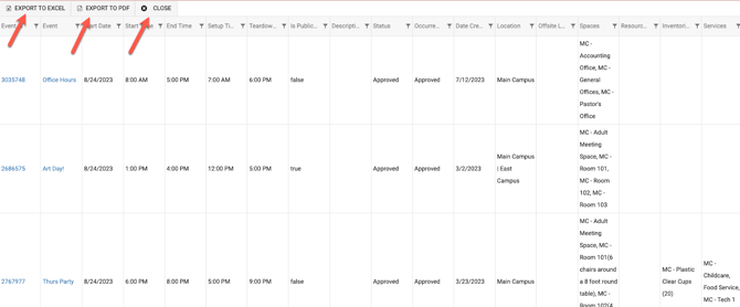 - After you export the events, you can Export to Excel in order to adjust the columns and/or rows and then print, Export to PDF (keep it as is) or choose to close the report.