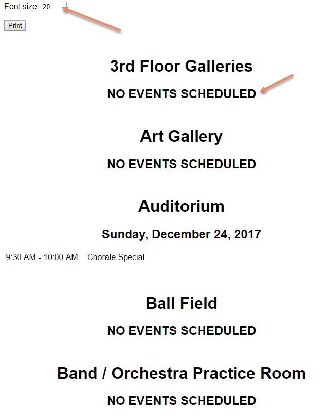 - Here is what the Space Output report looks like. Notice that you can enter a desired "Font size". Also because I selected "Show Spaces With No Events", you can see the space with "No Events Scheduled" below the space. When you print the room cards, a card is printed for each space (landscape or portrait).