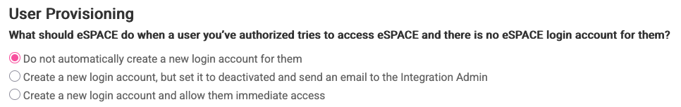 - Select an Integration Admin. This person will be notified when someone tries to access eSPACE from Okta, but they don't have an eSPACE account. eSPACE will create an account for them, but set them to be "inactive" and send a notification to the Integration Admin to let them know (and activate their account in eSPACE).