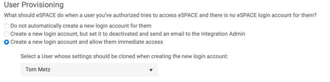 - However, if they do not have an eSPACE account already, a new eSPACE user account may be provisioned depending on this setting on the eSPACE SSO Setup page: