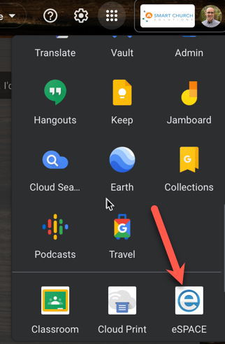- Test your connection by opening a private or incognito, logging into Google, and then finding and clicking the eSPACE button from the Google App launcher.