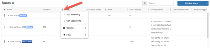 - On the space page (or resource page or service page) any column can be sorted or filtered in order to see the spaces that you need.