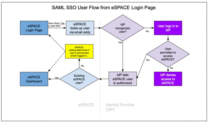 The problem you may be having is that in that first purple box "IdP recognizes user?", Google thinks you are someone that is NOT authorized to access eSPACE. eSPACE doesn't have any influence over Google in telling them who you are (otherwise SSO would have a huge security hole). So, unfortunately, there is nothing that we can do on the eSPACE side to convince Google that you are who you say you are.