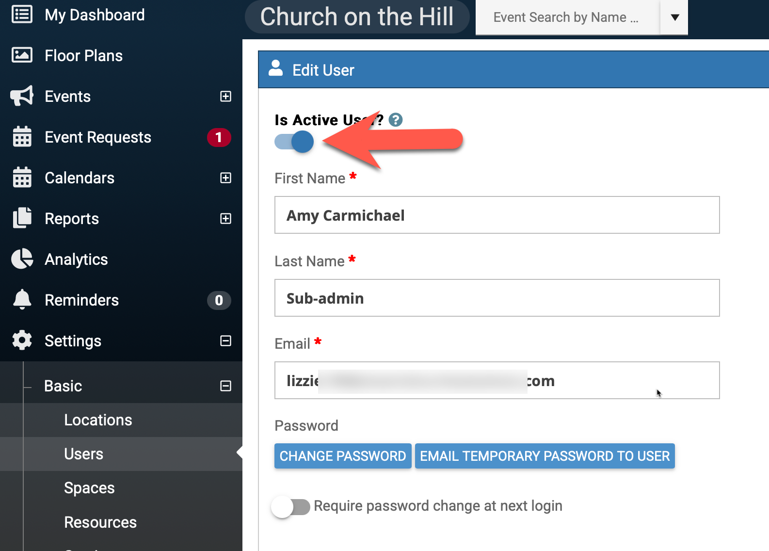 From the User's Profile Page, you will see a toggle for Is Active User.