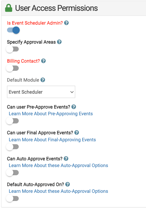 Admins have the ability to be set up with different permissions, such as approve events within a specific approval area, pre-approve event, final-approve events, and more.