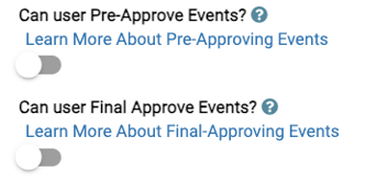 - If your org requires Pre-Approval and/or Final Approval (based on Settings), you will have the option to give the Admin these permissions (see attachment above). If your organization does not require these, the permissions will not be displayed within their User Access Permissions.