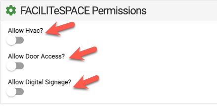 If you are also subscribed to COOLSPACE, SECURESPACE or INFOSPACE (sub-modules of FACILITeSPACE) then you can allow users to have access to set overrides for HVAC, doors access, or digital signage on their events in Event Scheduler. However, in order for users to have access to the full functionality of the HVAC and Door Access integration in FACILITeSPACE, the user must be an admin in Event Scheduler.
