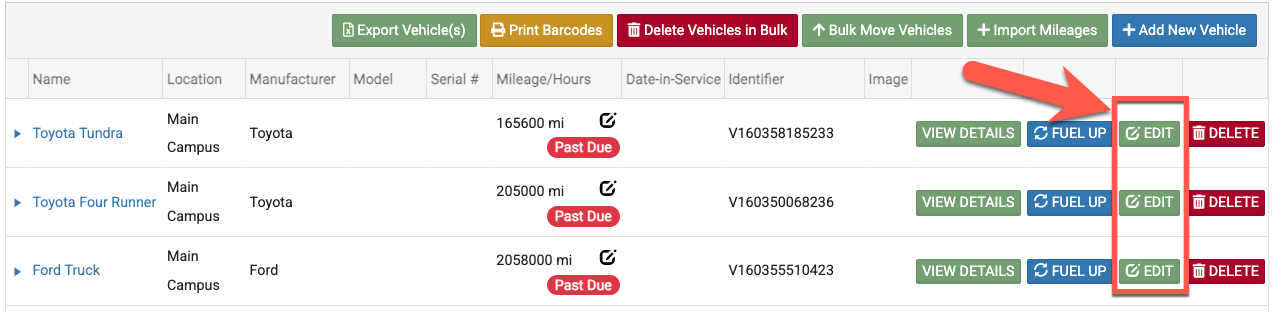 - 5. Once the user-defined field has been added to vehicles (and is active), when you click on Vehicles (A.) in your left side menu bar and then choose "Edit" (B.), you will see the custom field (C.).