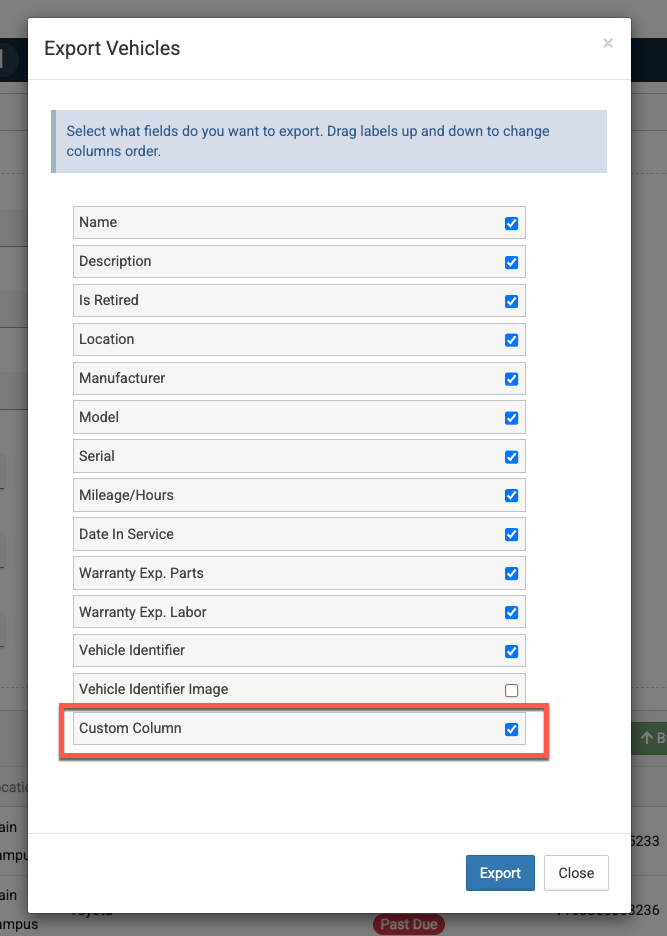 When you export Vehicles to an Excel file, your custom columns can be included!