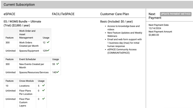 - To know how many events, work orders, and items (spaces, resources, services & equipment pieces) are included in your subscription tier along with what features are included please reach out to support@espace.cool.