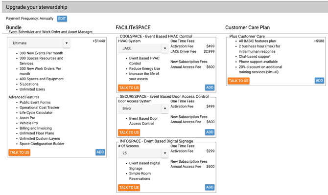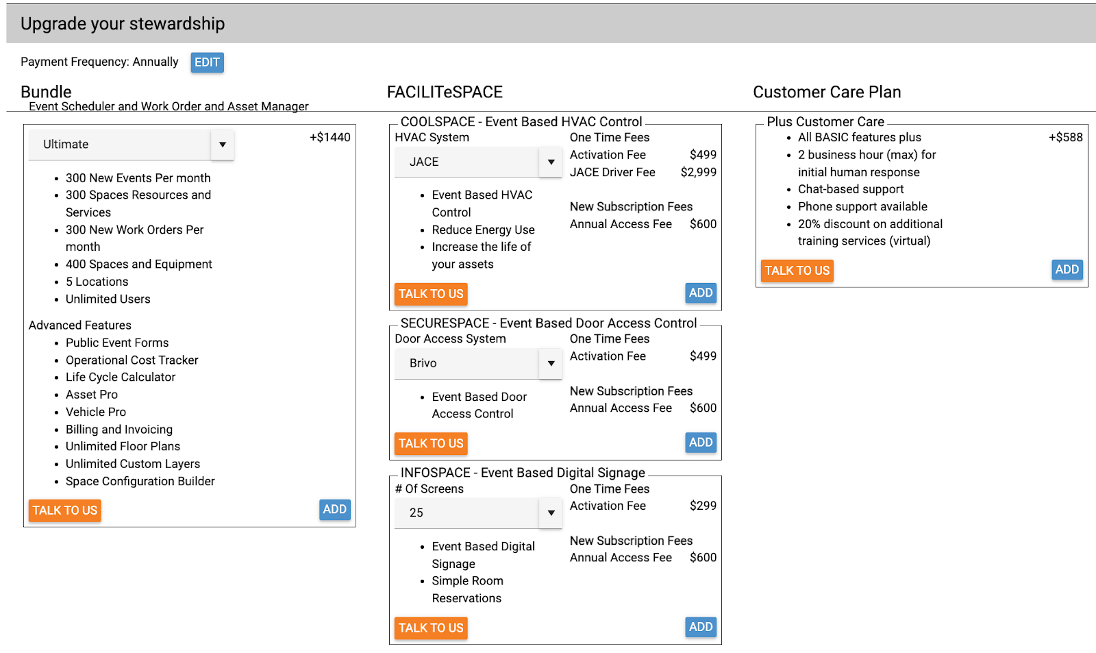 - Before you add anything to your subscription, we would love to meet with you and have a live demo. In order to schedule a demo with a salesperson, please click the "Talk to Us" button below any of the features on the Billing > Manage page.