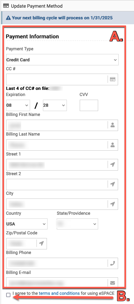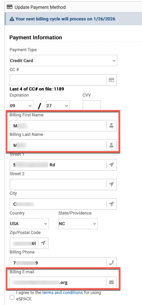 - If the subscription payment doesn't go through after several tries then eSPACE will automatically send an email to the main billing contact about the issue asking them to update payment information.