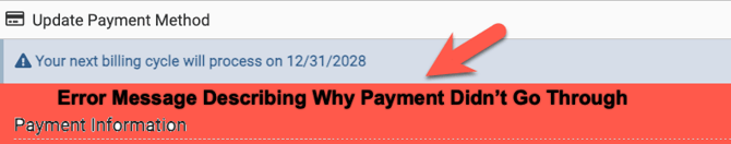 - All subscriptions paid for my credit card happen automatically on the regularly scheduled billing date and can not be manually moved or adjusted. Our system will try more than once to automatically process payment, but if it is unsuccessful for any reason, then an error message will display at the top of the Billing > Payment Method page.
