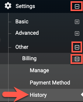 - Go to the left sidebar of your dashboard, select Settings > Other > Billing > Manage