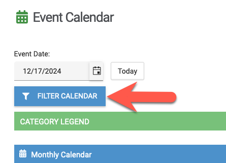 - 1. To filter, simply click the blue "Filter Calendar" button and a pop-up window will appear, where you can select your filter options (see below).