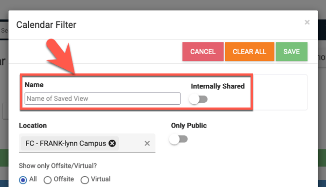 - B. If you select to create a saved calendar view you will then be presented with the option to name it and internally share it so other eSPACE users can see it as well in their eSPACE account.