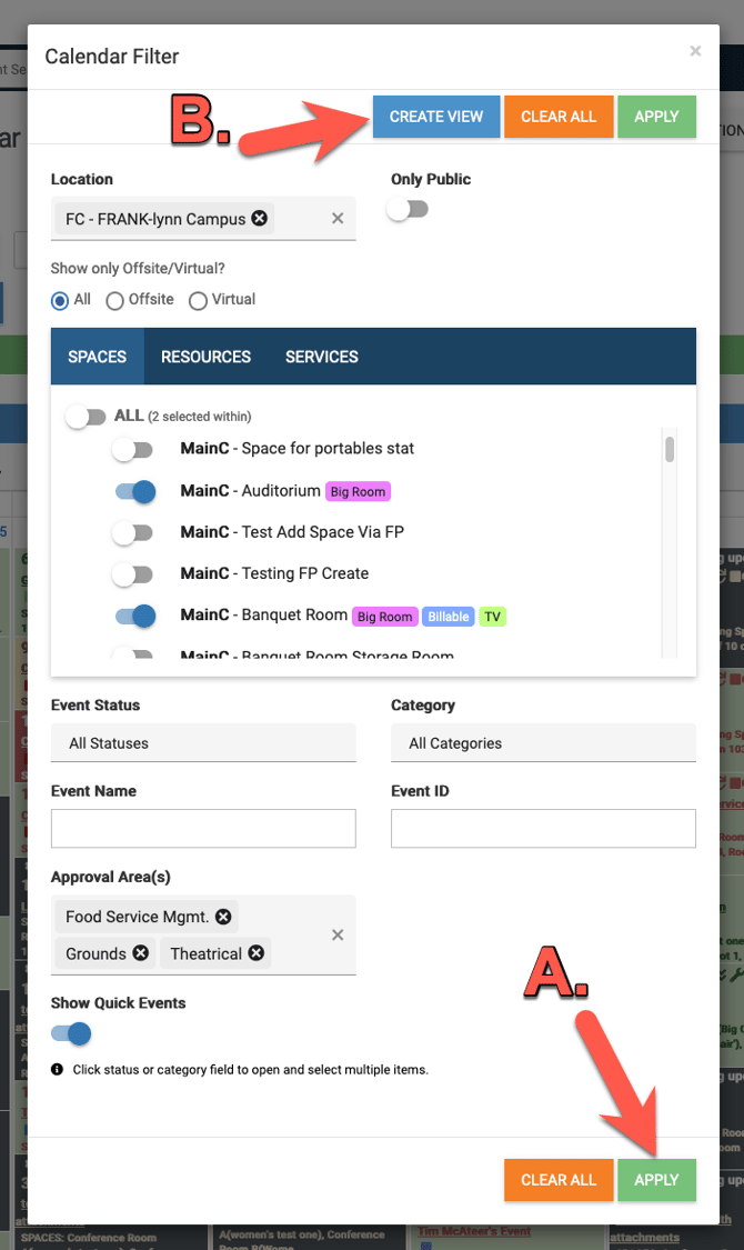 - Once you select your filter options, you can either click A. "Apply" or B. "Create View" which will save your filter selections.