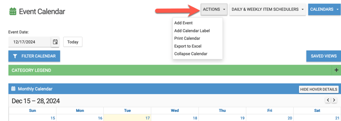 1.Actions - allows you to "Add Event", "Add Calendar Label", Print (available on some calendar views), Export and Collapse Calendar.