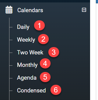 3.Calendars - You can either choose a different calendar view in the left menu bar or from the Calendar drop-down menu at the top right of the calendar page.
