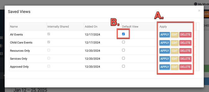 - In the pop-up box, you can A. choose to "Load", "Edit", or "Delete" any saved calendar view that you have created. B. You can also choose one of the save views to be your personal default view, which once chosen, will automatically load anytime you return to the internal calendar views.