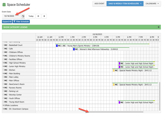 You can also view events based on the spaces, resources or services booked on the event with the various Item Scheduler views under Calendar on the left navigation bar.