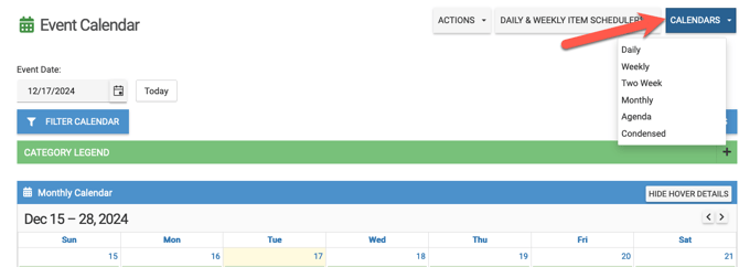 All the calendar views have the following options at the top right, however specific drop-down menu options for each may differ based on the calendar view chosen. The screenshots below are from the "Two Week" view.