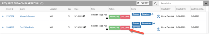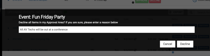 - When an event has declined items, you cannot approve it on the dashboard until those declined items have been addressed!