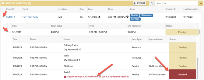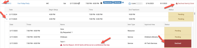 The owner of the event can see the declined item(s) on their dashboard (see below). Notice the red triangle icon next to the items and the "Decline Reason" below the name of the item.